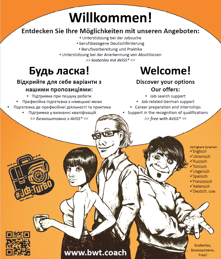 Das Angebot BWT #Job-Turbo besteht aus individuellen Coaching, die je nach Sprache, Sprachniveau, Qualifikation und Intension erarbeitet wird.